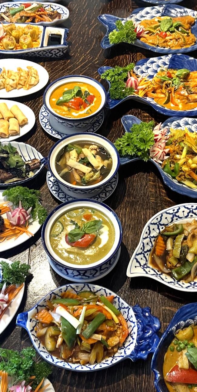 Dried-red chilli blended with coconut milk, bamboo shoots, peas, courgettes, peppers and sweet basil