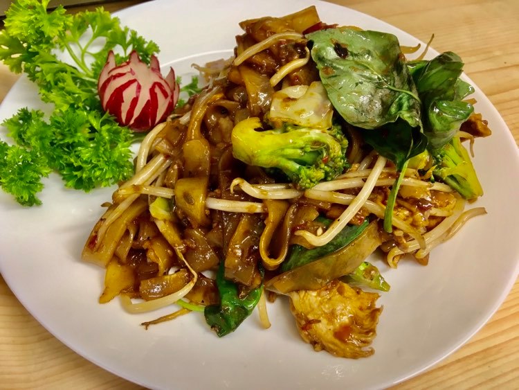 Thai thick rice noodles, broccoli, carrot, fresh chilli, Krachai and sweet basil