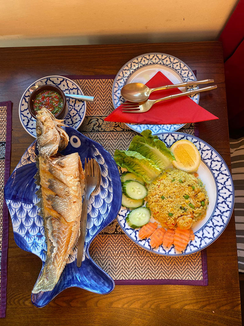 Crispy sea bass fillet, topped with Choo Chee (Red Curry) sauce and lime leaves. Served with jasmine rice.